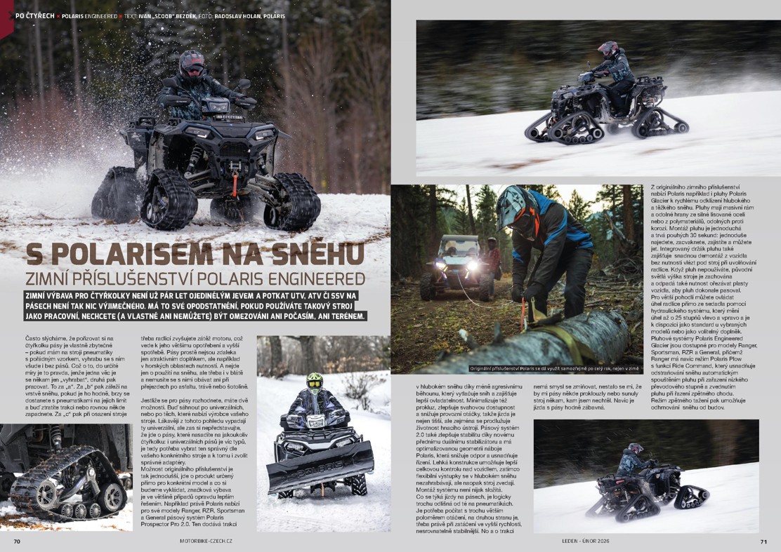 To bychom tedy měli testy, co dál? Tak třeba Techmánie, ve které se detailně věnujeme fenoménu poslední doby, motocyklovým automatickým převodovkám. V Reportech zas najdete nejen oblíbenou hitparádu našich testriderů Best of Motorbike, ale také podrobnou statistiku prodejů motocyklů a skútrů v ČR za loňský rok. Vyzkoušeli jsme i zimní výzbroj pro čtyřkolky Polaris a vyzpovídali Marca Bezzecchiho, jezdce MotoGP, který i letos bude hájit barvy týmu Aprilia Racing. V sekci Sport dále najdete reportáž ze Supercrossu v Paříži a road racingové Macau GP, úvahu o tom, kam spěje šampionát WSBK, aktuální informace z ploché dráhy a především rozsáhlý článek z letošní Rally Dakar.