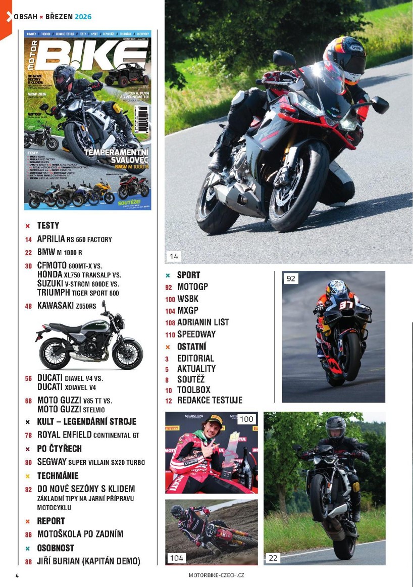 Protože minule jsme vynechali soutěž, v Motorbike 3/2026 pro vás máme dvě: o motorkářské džíny MBW a stylový balíček Motul. Nechybí ani aktuality (kde se dozvíte například podrobnosti o novém road racingovém seriálu European Series Road Racing), toolbox a redakční testy motovýstroje.