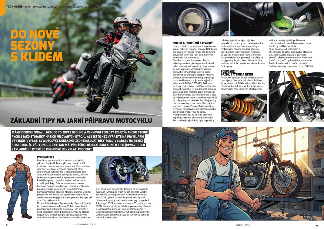 Konečně jsme se snad už dočkali a přichází jaro. Sice zatím pomalu, ale přeci jen se už dá aspoň na pár hodin vyjet, než nás večerní, nízké teploty zaženou zas domů. No a po příjezdu si můžete nalít do skleničky něco dobrého a otevřít nový Motorbike, který právě vychází. Tentokrát v něm, krom jiného, najdete i testy hned 12 strojů!