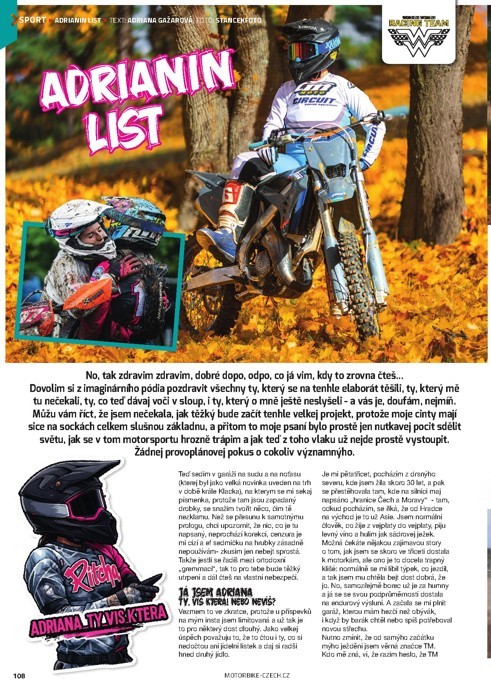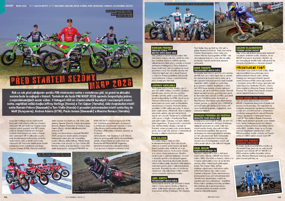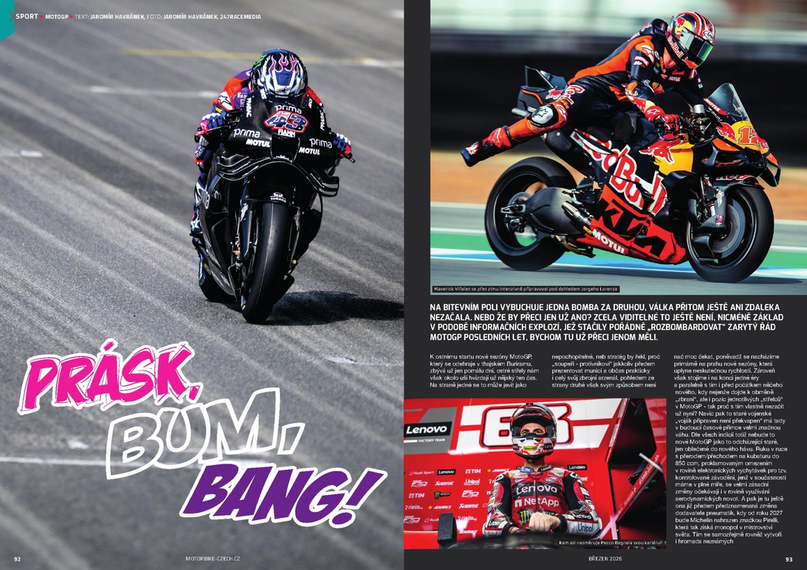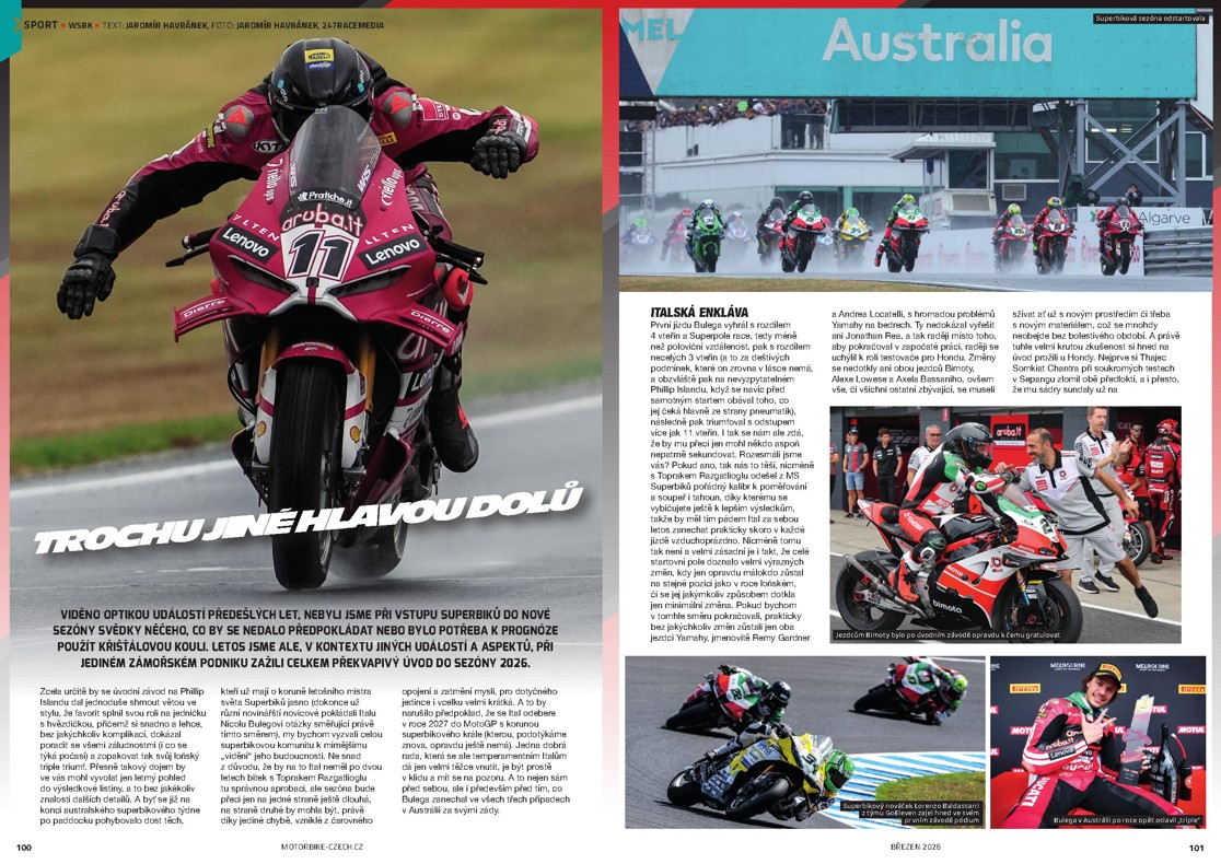 Naplno už začaly i sportovní seriály a tak se krom reportáže z prvních závodů WSBK dozvíte v aktuálním vydání Motorbike i novinky ze zákulisí MotoGP, seznámíme vás s hlavními aktéry letošní MXGP a tradičně jsme nevynechali ani plochou dráhu. A v sekci Sport najdete i novinku Adrianin list, kde vás bude po celý rok seznamovat závodnice týmu WWRT Adriana Gažarová se svými zážitky ze světa endura.
